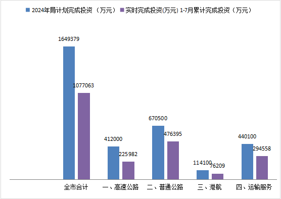 截至2024年7月底,香港六合彩开奖号码 交通运输固定资产完成投资107.7亿元,占年度投资计划165亿元的65.3%,超序时进度7%。其中,高速公路完成投资22.6亿元,占年度计划54.9%;普通公路完成47.6亿元,占年度计划的71.1%;港航建设完成7.6亿元,占年度计划的66.8%;运输服务完成29.5亿元,占年度计划的66.9%。