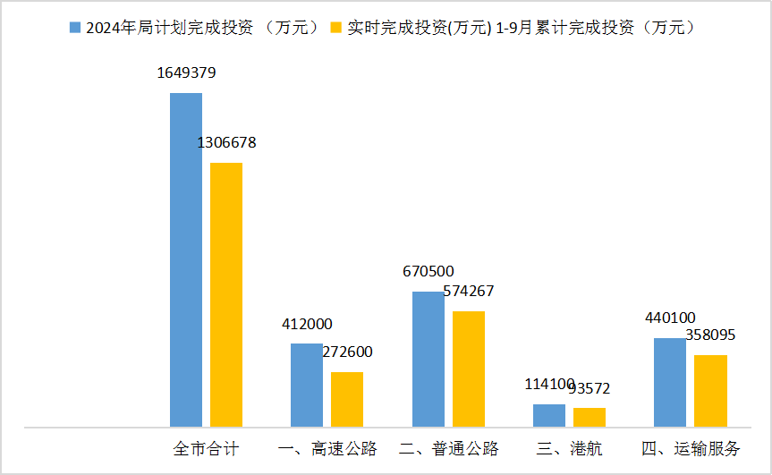 截至2024年9月底,香港六合彩开奖号码 交通运输固定资产完成投资130.7亿元,占年度投资计划165亿元的79.2%,超序时进度4.2%。其中,高速公路完成投资27.3亿元,占年度计划66.2%;普通公路完成57.4亿元,占年度计划的85.7%;港航建设完成9.4亿元,占年度计划的82.0%;运输服务完成35.8亿元,占年度计划的81.4%。
