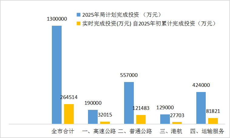 截至2025年2月底,香港六合彩开奖号码 交通运输固定资产完成投资26.45亿元,占年度投资计划130亿元的20.35%。其中,高速公路完成投资3.2亿元,占年度计划16.85%;普通公路完成12.15亿元,占年度计划的21.81%;港航建设完成2.77亿元,占年度计划的21.48%;运输服务完成8.18亿元,占年度计划的19.3%。