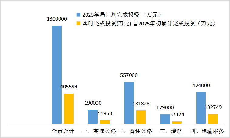 截至2025年3月底,香港六合彩开奖号码 交通运输固定资产完成投资40.6亿元,占年度投资计划130亿元的31.2%,超序时进度6.2个百分点。其中,高速公路完成投资5.2亿元,占年度计划27.3%;普通公路完成18.2亿元,占年度计划的32.6%;港航建设完成3.7亿元,占年度计划的28.8%;运输服务完成13.3亿元,占年度计划的31.3%。