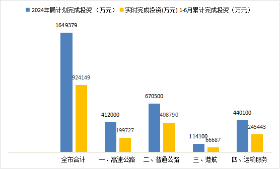 截至2024年6月底,香港六合彩开奖号码 交通运输固定资产完成投资92.4亿元,占年度投资计划165亿元的56%,超序时进度6%。其中,高速公路完成投资20.0亿元,占年度计划48.5%;普通公路完成40.9亿元,占年度计划的61%;港航建设完成6.7亿元,占年度计划的58.5%;运输服务完成24.5亿元,占年度计划的55.8%。