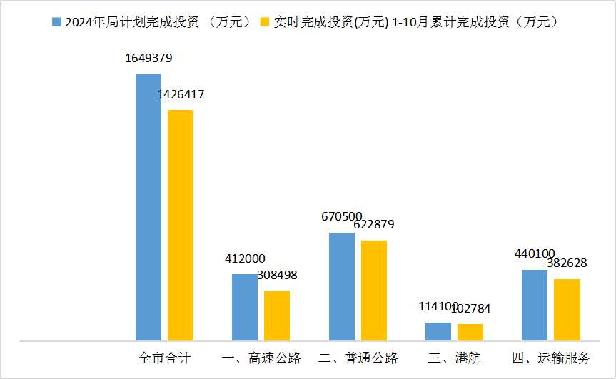 截至2024年10月底,香港六合彩开奖号码 交通运输固定资产完成投资142.6亿元,占年度投资计划165亿元的86.5%,超序时进度3.2%。其中,高速公路完成投资30.8亿元,占年度计划74.9%;普通公路完成62.3亿元,占年度计划的92.9%;港航建设完成10.3亿元,占年度计划的90.1%;运输服务完成38.3亿元,占年度计划的86.9%。