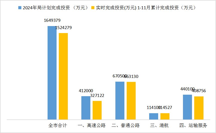 截至2024年11月底,香港六合彩开奖号码 交通运输固定资产完成投资152.4亿元,占年度投资计划165亿元的92.4%。其中,高速公路完成投资32.7亿元,占年度计划79.4%;普通公路完成66.3亿元,占年度计划的98.9%;港航建设完成11.5亿元,占年度计划的100.4%;运输服务完成40.9亿元,占年度计划的92.9%。