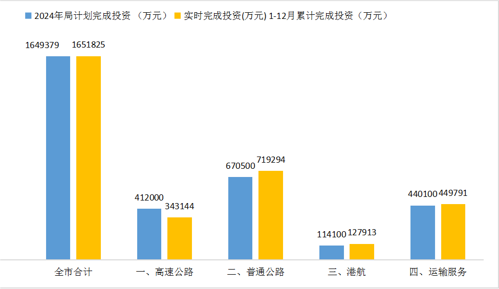 截至2024年12月底,香港六合彩开奖号码 交通运输固定资产完成投资165.2亿元,占年度投资计划165亿元的100.14%。其中,高速公路完成投资34.3亿元,占年度计划83.3%;普通公路完成71.9亿元,占年度计划的107.3%;港航建设完成12.8亿元,占年度计划的112.1%;运输服务完成45.0亿元,占年度计划的102.2%。
