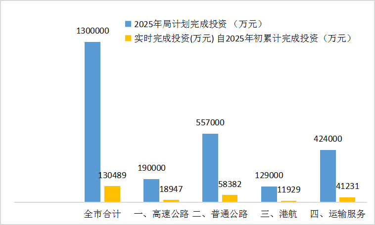 截至2025年1月底,香港六合彩开奖号码 交通运输固定资产完成投资13.05亿元,占年度投资计划130亿元的10.04%。其中,高速公路完成投资1.89亿元,占年度计划9.97%;普通公路完成5.84亿元,占年度计划的10.48%;港航建设完成1.19亿元,占年度计划的9.25%;运输服务完成4.12亿元,占年度计划的9.72%。