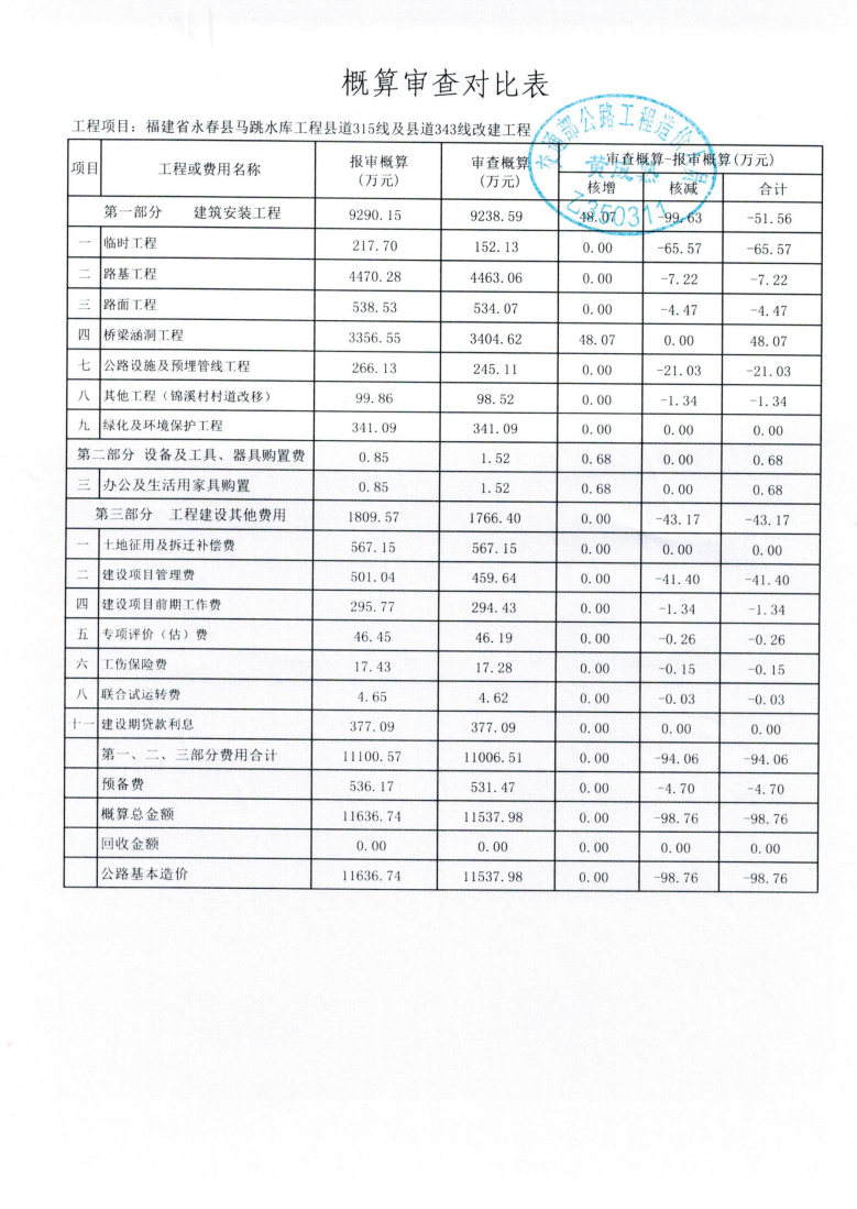 该项目设计概算编制基本符合交通运输部及我省有关规定。根据调整后的工程数量,核定初步设计概算为11537.98万元(其中建安费9238.59万元)。该项目总投资应控制在初步设计批复范围内。